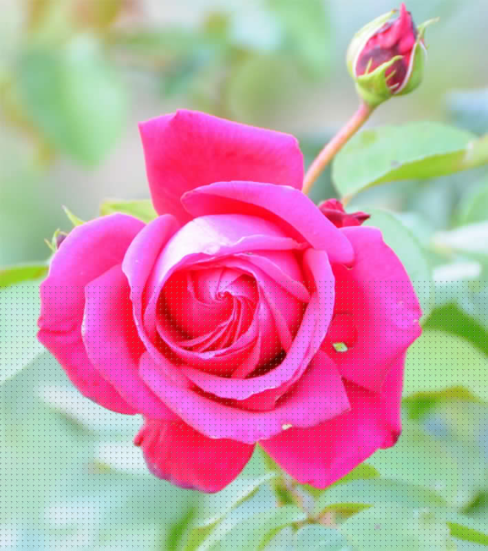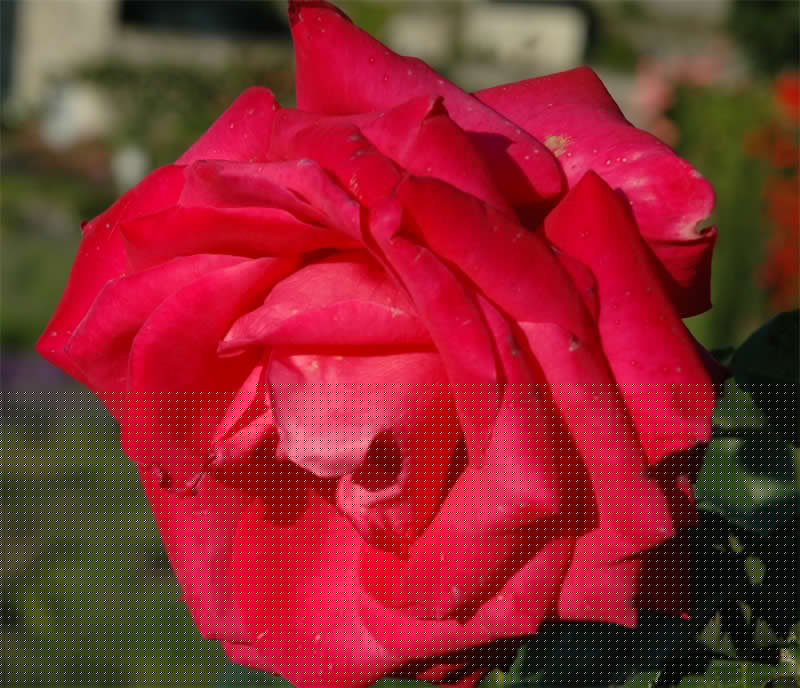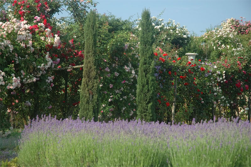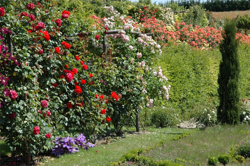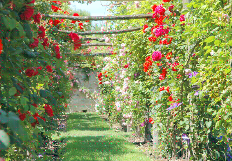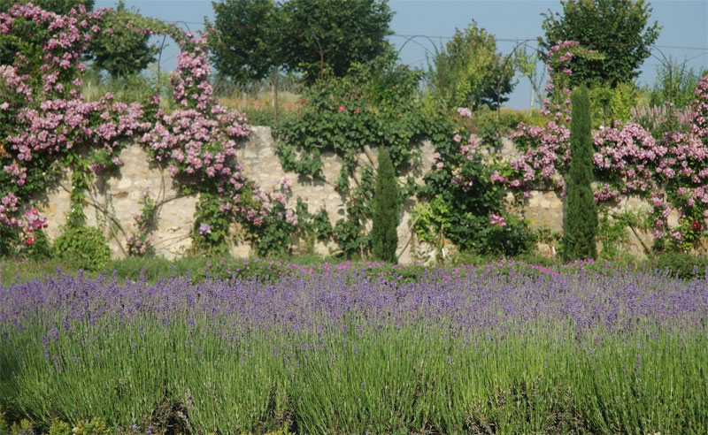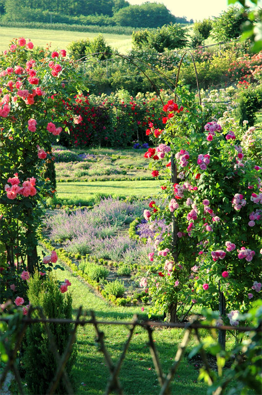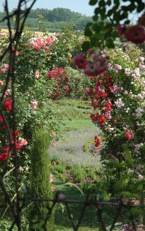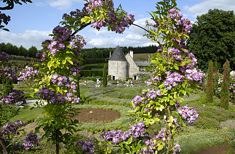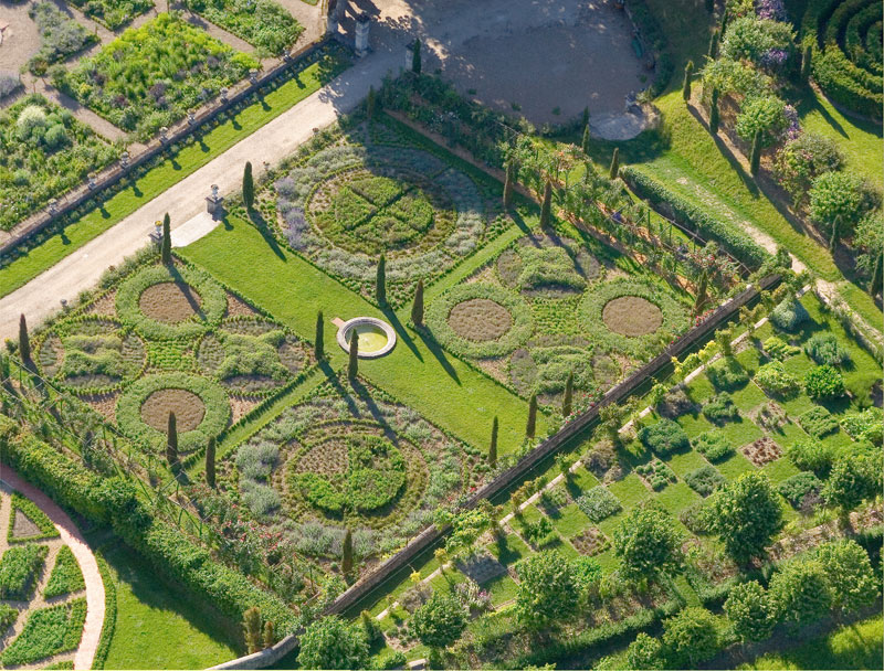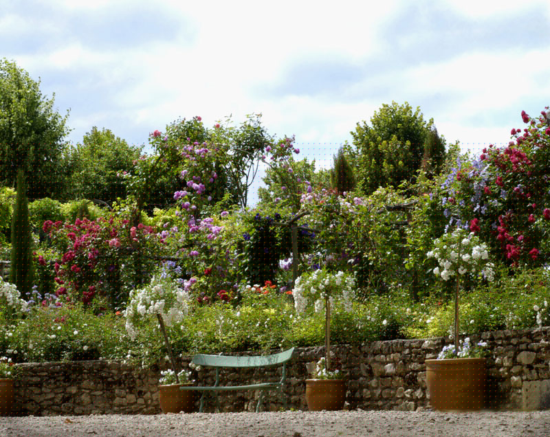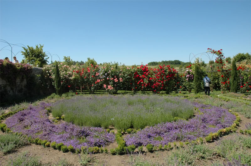 A l’aplomb, le Jardin de l’Intelligence (1998), encadré de pergolas couvertes de clématites bleues et de roses rouges, est chamarré de savantes arabesques insérées dans quatre carrés bleus et rouges.