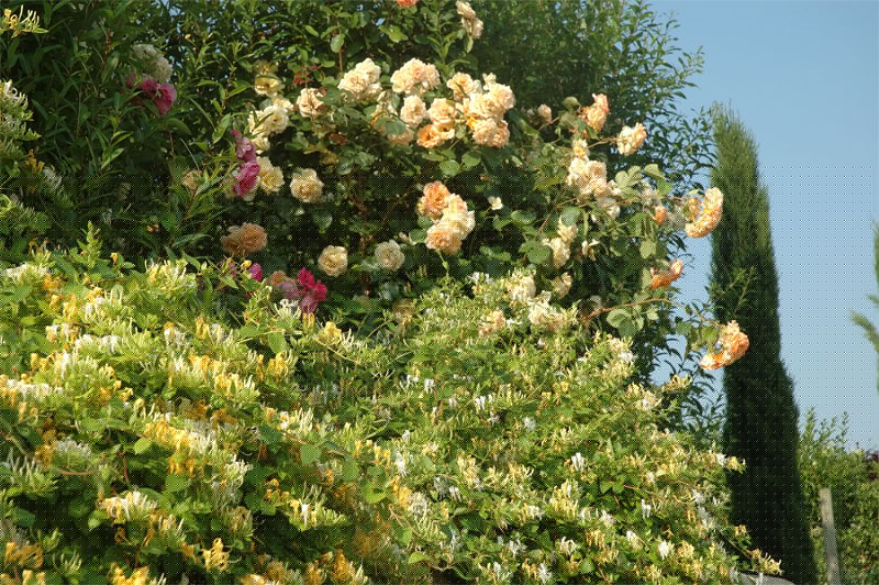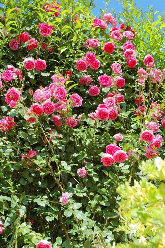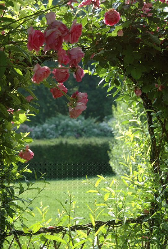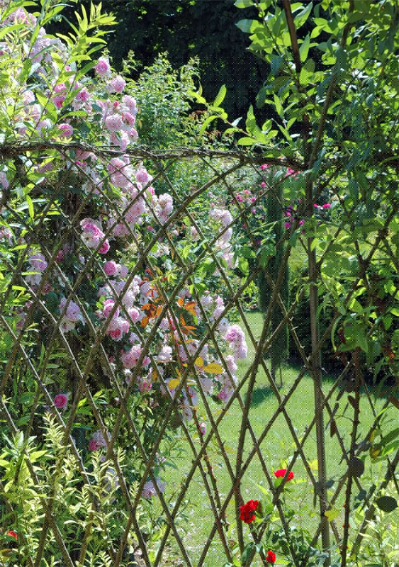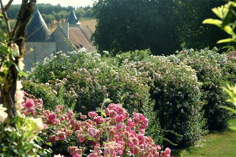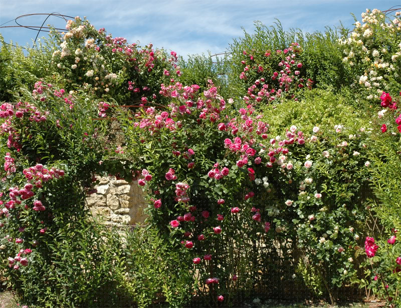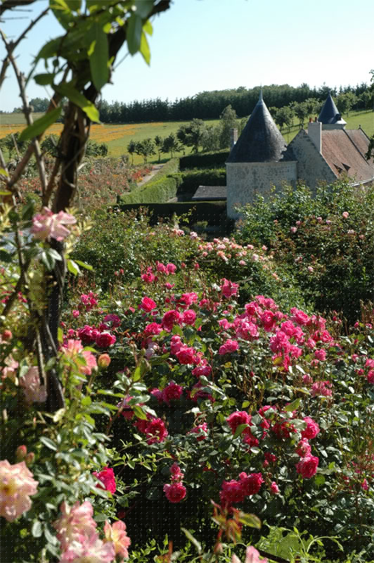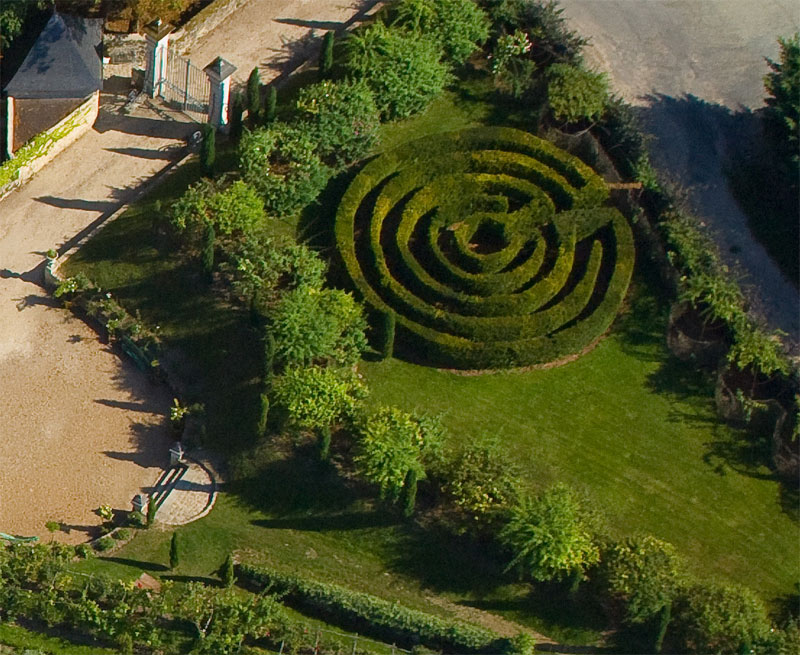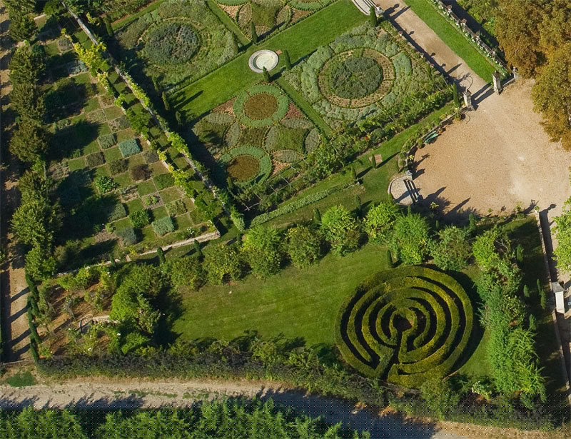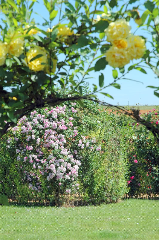 Inspiré du Songe de Polyphile, le Jardin des Romances (2002) est constitué d’un collier de trente salles de verdure rondes. Empanachées de rosiers grimpants qui forment autant de dômes chatoyants, leurs parois fragiles sont en osier tressé vivant. Adossé au cloître de l’amour, s’enroule un labyrinthe dont le dessin provient des Vikings.