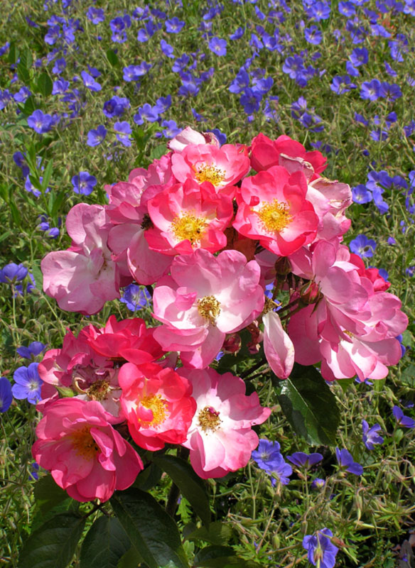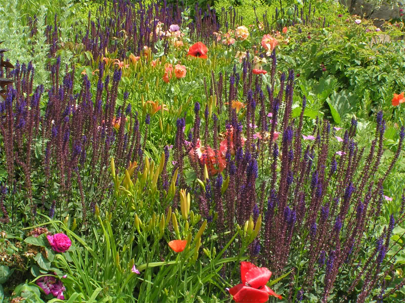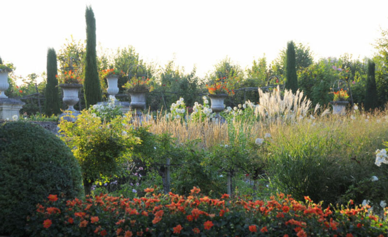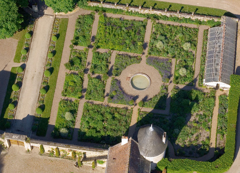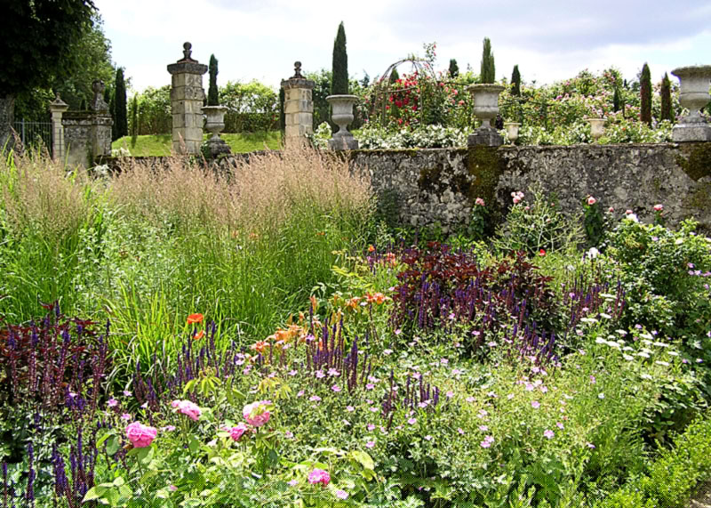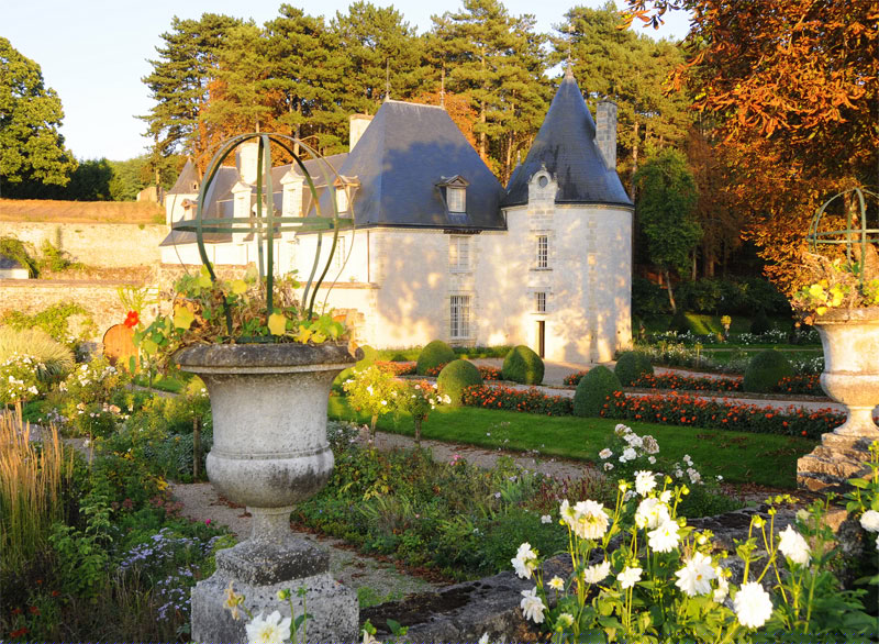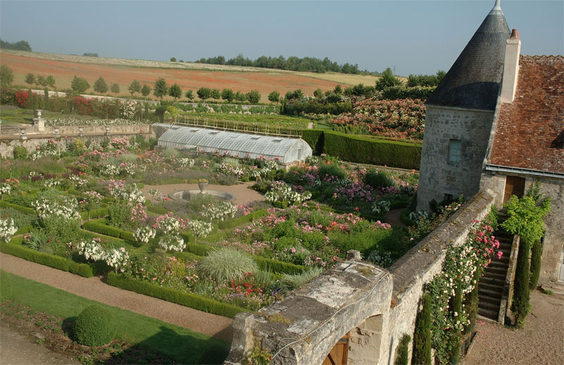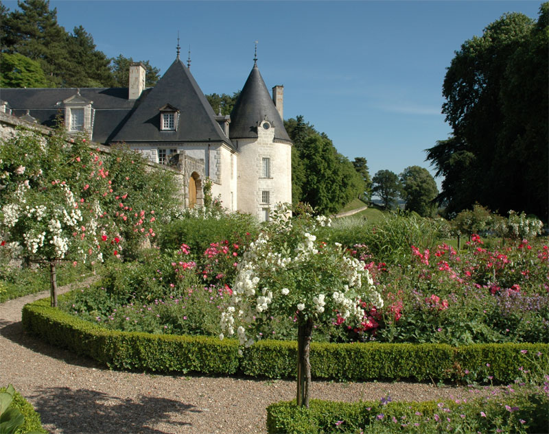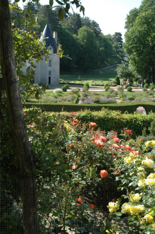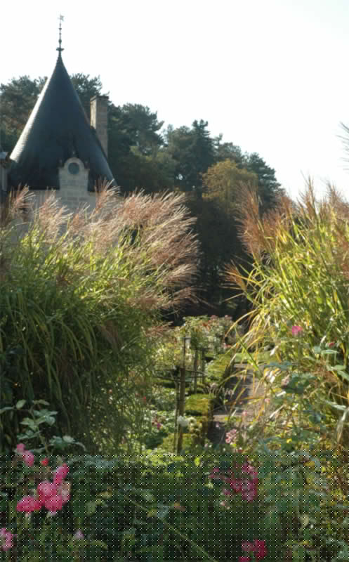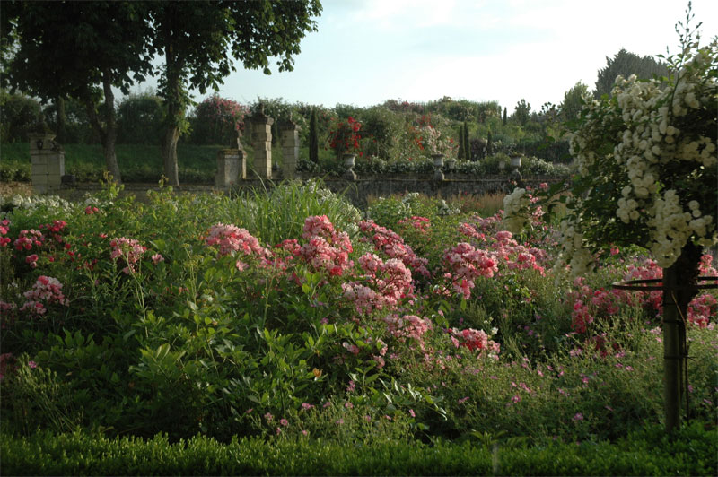 A l’ouest, au pied des tours médiévales, axé autour d’un bassin, le Jardin des Sens (1997) qui s’insère dans un dessin de buis, comble les cinq sens. Couverts de deux cents variétés de vivaces multicolores, ses massifs concentriques sont surmontés d’un nuage blanc de rosiers-tiges.